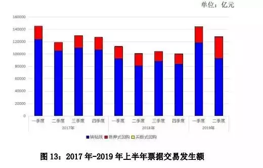 2019年上半年,票据交易量为27.21万亿元,同比增加5.94万亿元,增长27.9%。分交易类型看,转贴现为21.19万亿元,同比增加3.79万亿元,增长21.79%;质押式回购为5.99万亿元,同比增加2.11万亿元,增长54.48%;买断式回购为336.36亿元。其中,电票交易27.15万亿元,纸票交易626.13亿元;银票交易25.56万亿元,商票交易1.66万亿元。