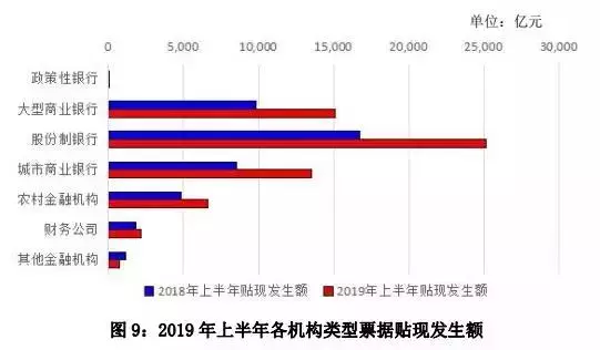 2019年上半年,商业汇票贴现发生额为6.32万亿元,同比增加2.04万亿元,增长47.53%;6月末,贴现未到期金额为8.05万亿元,较年初增加1.46万亿元,增长22.11%。其中,电票贴现发生额为6.28万亿元,纸票450.42亿元;银票5.82万亿元,商票4999.46亿元。