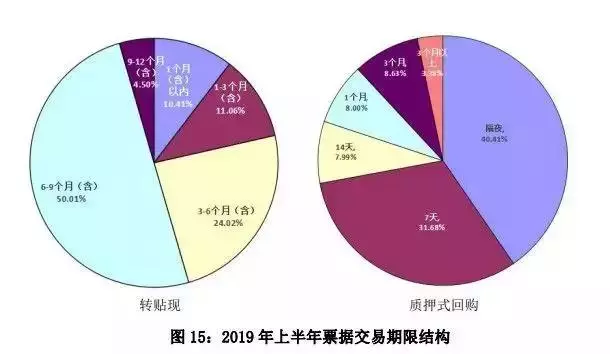 转贴现票据的期限主要集中在3-6个月和6-9个月,二者占比分别为24.02%和50.01%。质押式回购业务主要集中在隔夜和7天期回购业务,二者占比分别为40.41%和31.68%。
