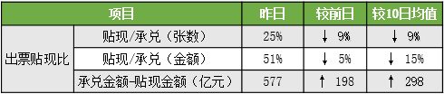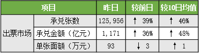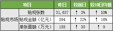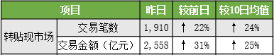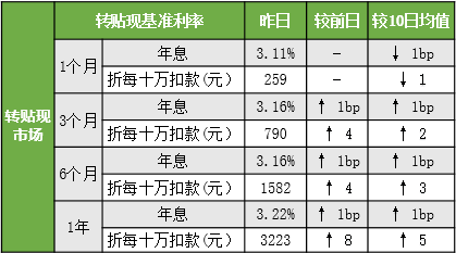 点评:出票市场活跃提升较大,承兑张数和承兑金额较前日分别大幅上涨39个百分点和36个百分点。贴现张数和贴现金额较前日分别上涨3个百分点和22个百分点,说明贴现市场当日大面额票交易开始活跃。转贴现市场开始上行,交易笔数和交易金额较前日分别上涨22个百分点和31个百分点。6个月国股转贴现利率3.16%,较前日上涨1个bp,折合每十万扣款1582元。资金市场上,央行当日未开展逆回购操作,同时无逆回购到期,银行体系流动性总体看合理充裕。隔夜Shibor继续开始上行,但幅度不大,较前日上涨2个bp,短期资金面仍较为宽松。