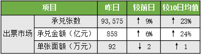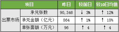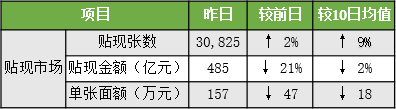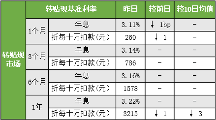 点评:出票市场波动不大,承兑张数较前日下跌3个百分点,而承兑金额较前日上涨1个百分点。贴现张数较前日上涨2个百分点,而贴现金额较前日下跌21个百分点。转贴现市场开始下行,但幅度不大,交易笔数和交易金额较前日分别下跌8个百分点和6个百分点。6个月国股转贴现利率3.16%,与前日持平,折合每十万扣款1578元。资金市场上,央行当日未开展逆回购操作,同时无逆回购到期。短期资金面较为宽松,隔夜Shibor继续下行,较前日下跌11个bp,跌至1.00%,创近4年新低。