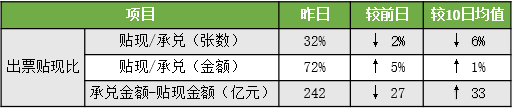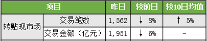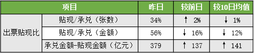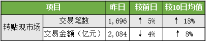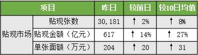 点评:出票市场活跃度持续提升,承兑张数和承兑金额较前日分别上涨9个百分点和6个百分点。贴现市场继续上行,贴现张数和贴现金额较前日分别上涨2个百分点和14个百分点,说明临近月末金融机构对票据资产的需求开始不断增加。转贴现市场小幅振荡,但幅度不大,交易笔数较前日上涨5个百分点,而交易金额较前日下跌4个百分点。6个月国股转贴现利率3.16%,较前日上涨1个百分点,已连续13个交易日在3.15至3.16左右波动。资金市场上,当日无逆回购到期,央行开展300亿逆回购操作。短期资金面持续宽松,隔夜Shibor继续下行,较前日下跌14个bp。